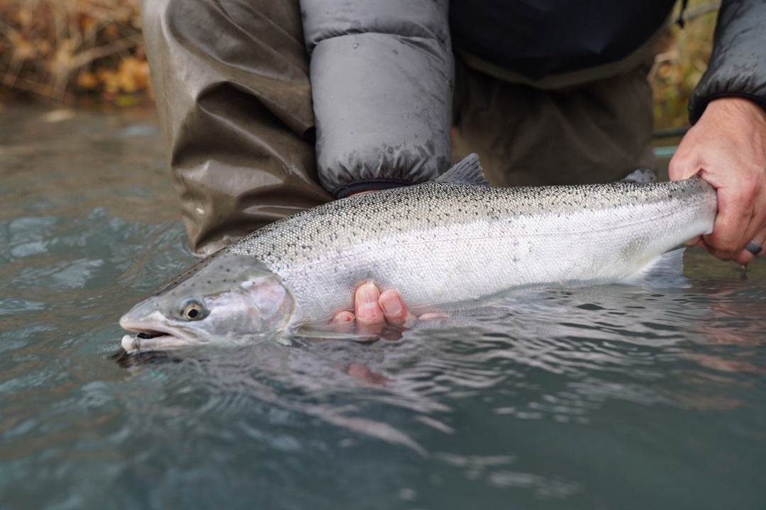 We will launch at Tustumena Lake and float in a drift boat to the Kasilof River State Park. It as about a 10-mile float. The start of there float is slow moving water and we utilize a small motor to speed up the process to start our fishing. Once we hit moving water we will float to a run then get out of the boat and wade fish using two-handed rods. Most runs are gravel bars and easy to wade. You can also fish from the boat on the Kasilof with a single hand, beads, and indicator for trout if you wish but that is typically not our focus. Skagit lines with a 7 or 8 wt rod is best with an assortment of sink tips. We also venture out to the Anchor River or Deek Creek, about a one hour drive South from the Kasilof. These rivers are small and we walk and wade them. Typically using a 7 weight single hand rod with a floating line or a switch rod with a floating line/sink tip line.